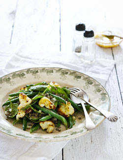 1 Preheat the oven to 240°C (220°C fan-forced). Place the broken haloumi and beans onto a lightly greased baking tray and cook for 10–12 minutes or until haloumi is golden.